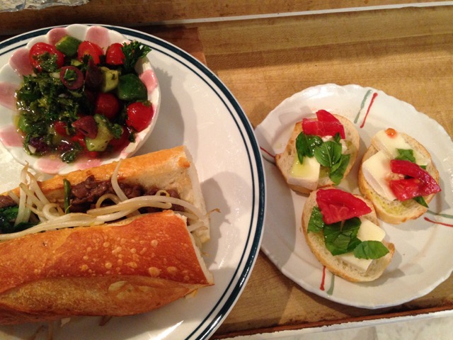 今日のランチは「多国籍ロサンゼルス風」。韓国焼肉フィリーズサンド、イスラエルサラダ、イタリアンブルスケッタ、ブリーチズ添え。色々な国の料理を一辺に食べたい時は、自分で作るしかありません。良質な材料を思いっきり使っても、外食するよりお得かもしれません。