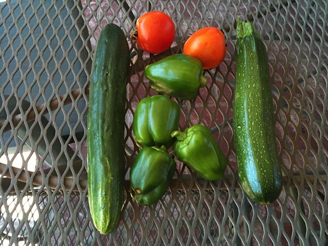 6月に野菜の苗を植えた時はこんな感じでした。↑今月(8月の初め)になるとこんな感じになりました。↓ そして、収穫の日。今年は少ししか苗を植えませんでしたので、たくさんの収穫はありませんが、その日のハーベストを楽しませてくれます。天の恵みに感謝!