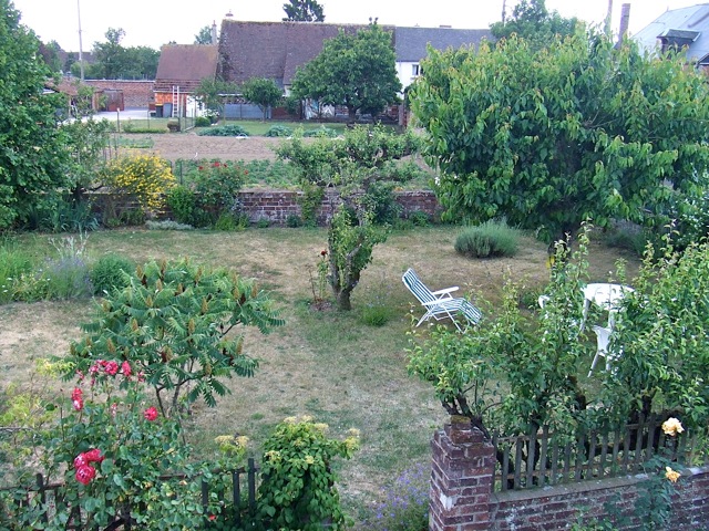 外でアペリティフと言われ、どこにでもあるような椅子とテーブルの上に、ポテトチップスとワインだけ。でも、のどかで空気のいいお庭で、おしゃべりしていると夕暮れになり、近くの古い教会から鐘の音が響いてきます。