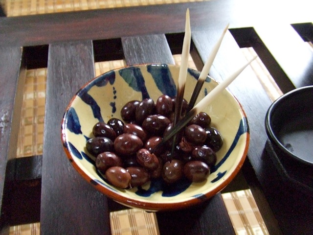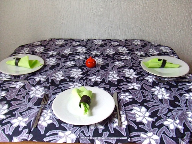 ニューカレドニアで仕入れた布で作ったテーブルクロスの上に、中近東のマーケットで買った赤い入れ物(塩を入れていました)、アフリカのどこかで買ったハリネズミの針を楊枝に使ったりと、とても素敵です。そしてそれらすべての物に、旅の思い出があって話が弾みます。