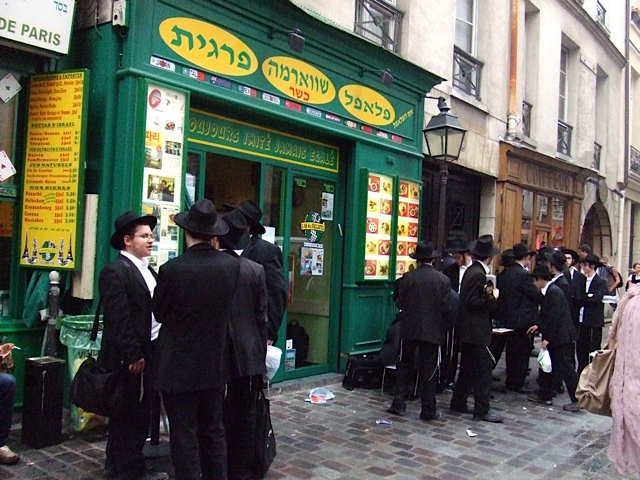 写真は4年前のパリ旅行の時に取りました。マレ地区のユダヤ人通りで、安くて美味しいファラフェル サンドウィッチを食べました。若者のオーソドックスユダヤ人が楽しそうに、集まってした。