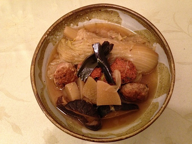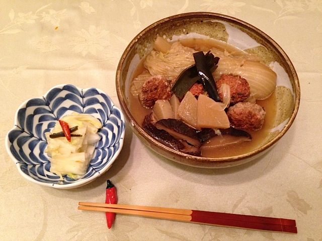 昨年のNCM2日本ミッションツアーの時に博多駅で茅乃舎さんの野菜だしを手に入れたので、白菜、大根、干し椎茸、ごま油で炒めたターキーのミートボールを入れて、煮込んでみました。