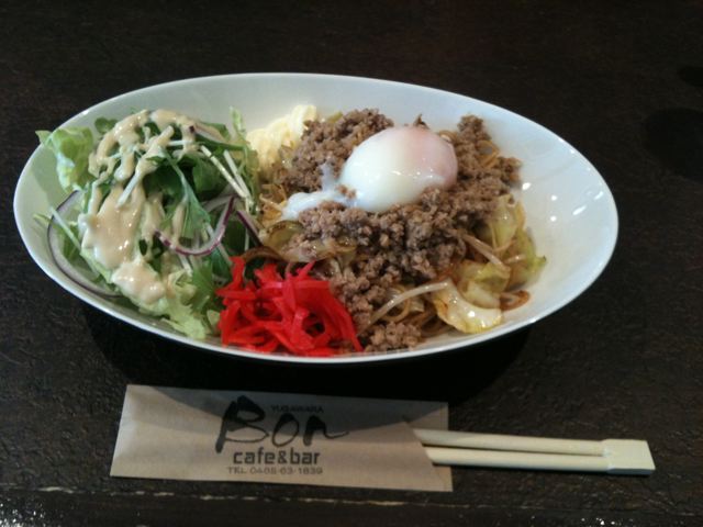 ここ”BON(Cafe & Bar, Bon)の”担々焼きそば”には温泉卵がトッピングされていました。(さすが温泉場です)おいしい焼きそばですよ。坦々やきそばだけでなく、カレー、ハヤシライス、蟹サンド、スパゲティー等等、どれも美味しいものばかりです。